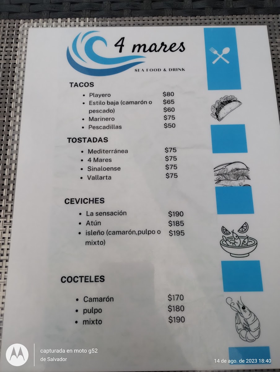 Introducing the menu at 4 Mares, a hidden gem in Puerto Vallarta's bustling Zona Hotelera. Nestled in La Isla, this charming seafood haven captivates diners with its impressive selection of fresh catches and culinary creativity. Guests rave about the Ceviche La Sensacion, hailed as a must-try, perfectly blending vibrant flavors. The standout seafood tower delights with an assortment of shrimp and tuna, expertly prepared and served promptly with a friendly smile.